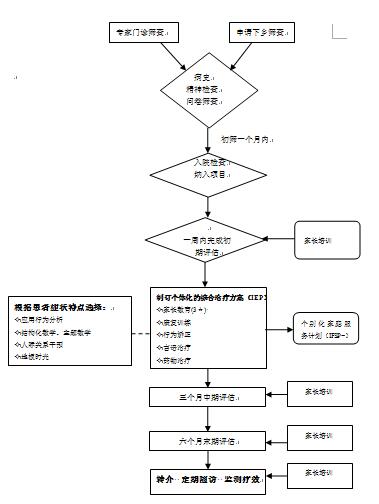 ——康复训练:每位患儿入机构后在一周内由医师、特教老师、康复治疗师、护士等专业人员组建的康复团队评估小组,完成对患儿包括:粗大动作、精细操作、语言、认知、感知能力、生活自理能力、社会交往能力、情绪行为控制等七大领域的初期评估,根据初期评估的结果,制定短期、中期、长期康复目标。随之提供符合患儿自身特点的个别化康复治疗方案,安排运动疗法、作业疗法、语言训练、认知训练、感觉统合训练、多感官训练、生活自理能力训练、音乐治疗、行为矫治、针灸推拿等适合自身特点的治疗,采取个训与集体训练相结合等一系列的康复训练形式。每月进行一次阶段小结。三个月后进行中期评估,讨论治疗效果,调整治疗计划及方案,再次制定康复目标并实施。半年后,完成末期评定,决定下一次康复项目。
