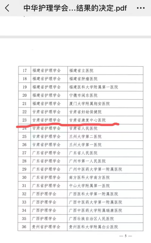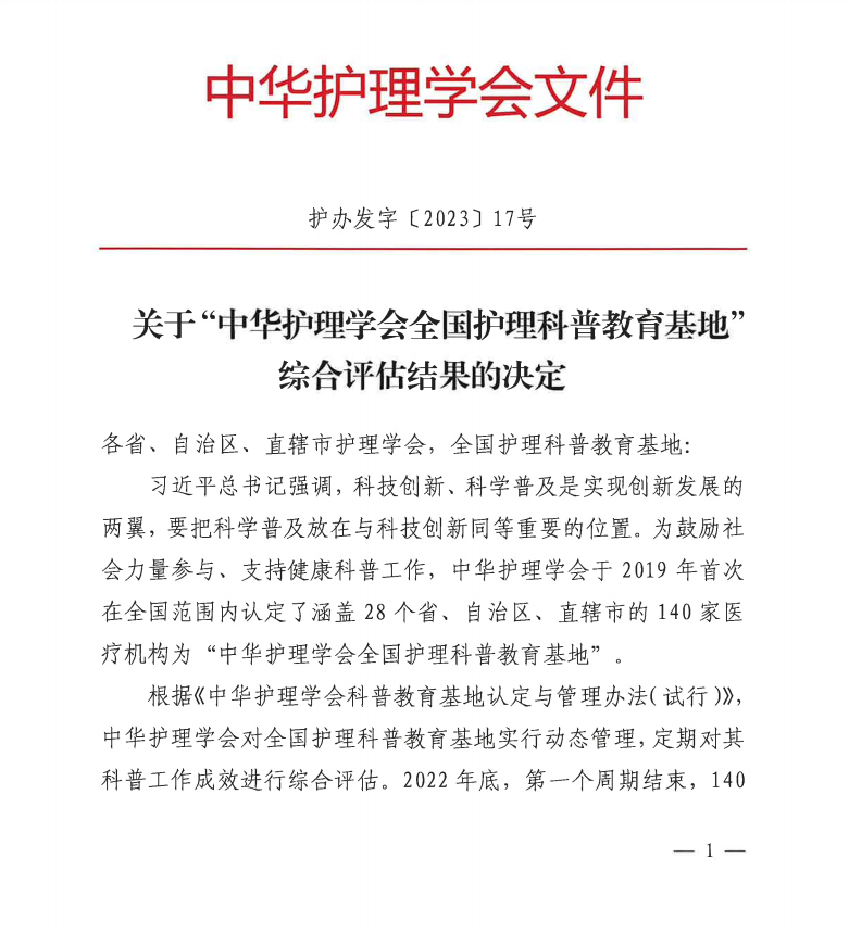 5月10日,省康复中心医院被中华护理学会再度评为全国护理科普教育基地。2022年9月,按照中华护理学会《关于开展中华护理学会全国护理科普教育基地综合评估工作的通知》文件要求,医院护理部依据《中华护理学会科普教育基地认定与管理办法(试行)》文件精神,认真准备,积极组织申报,经医院自评、甘肃省护理学会推荐审核、中华护理学会审核认定、评议与公示等环节,最终以一流的护理专业师资队伍、专业的健康教育管理能力、精湛的护理专业技术、优质的护理服务,再度被评为全国护理科普教育基地。